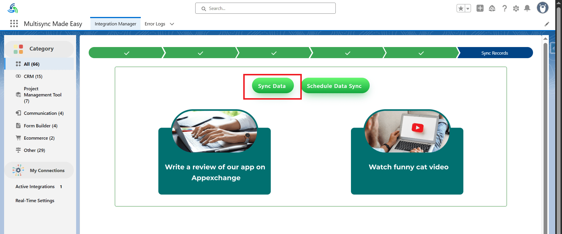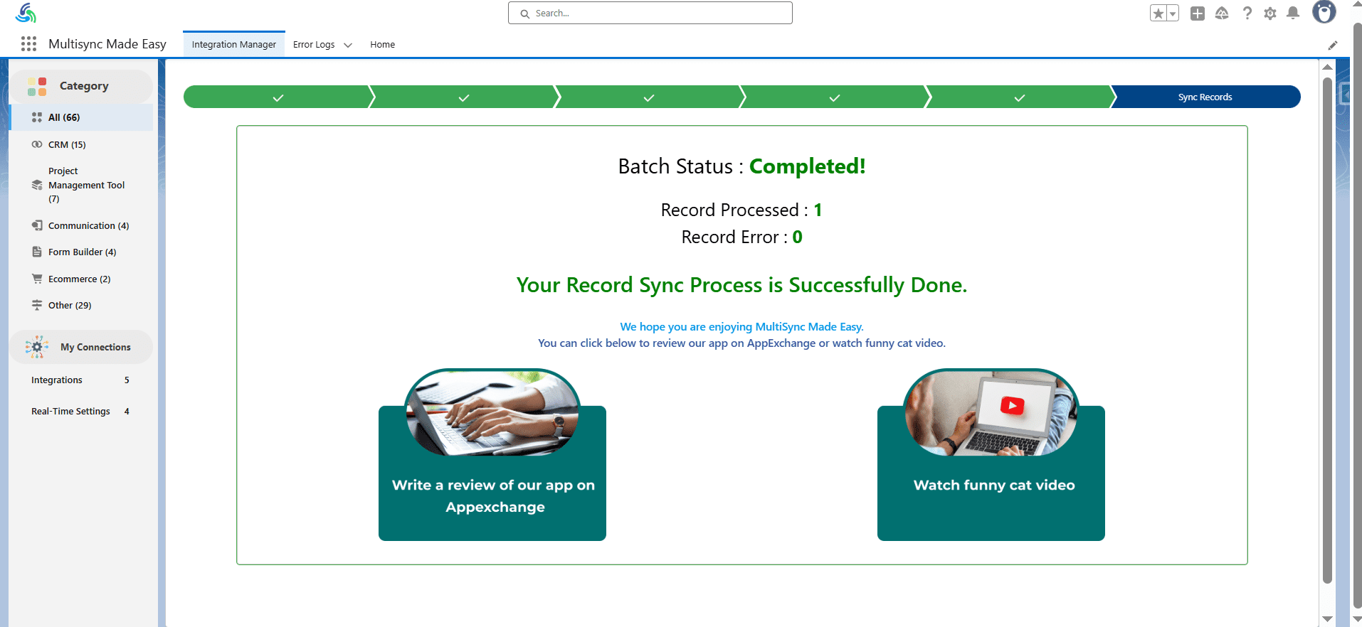 Step 28. After the complete process, the data of the connected app is stored in your Salesforce object with the help of Multi-Sync Made Easy, and you will be redirected to the Sync Completed page.
